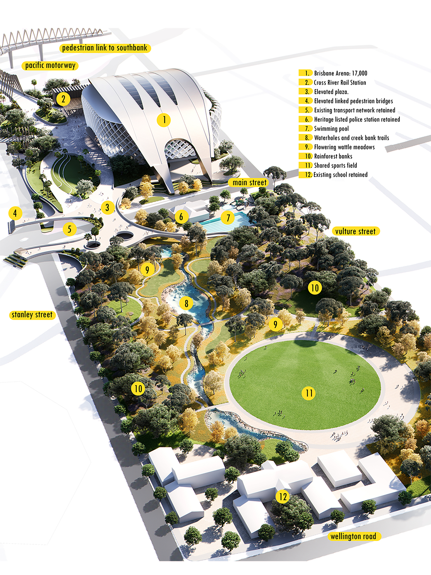 The streets are green, shaded and protective – creating a vibrant edge to the park and the new Gabba heart.