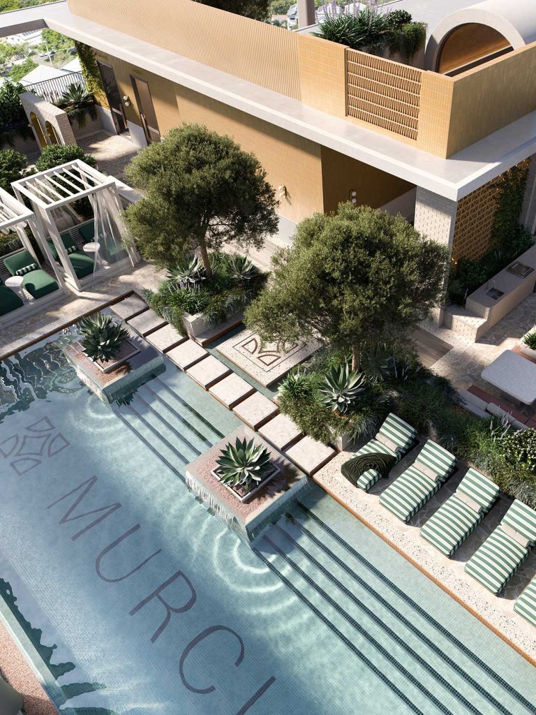 The landscape is inspired by the Murcia region of Spain – famous for its rich agricultural culture, authentic Mediterranean cooking and its tapestry of fields, gardens, patios, courtyards, water features and vibrant colours.