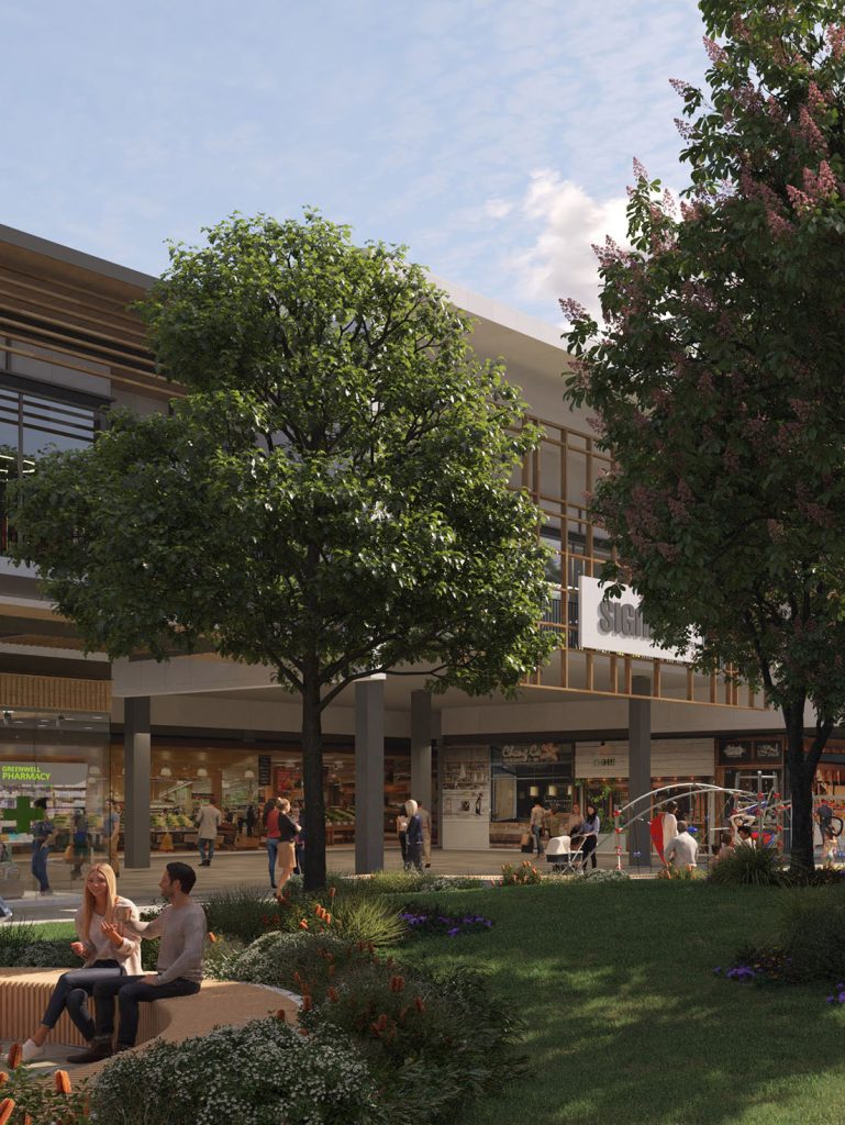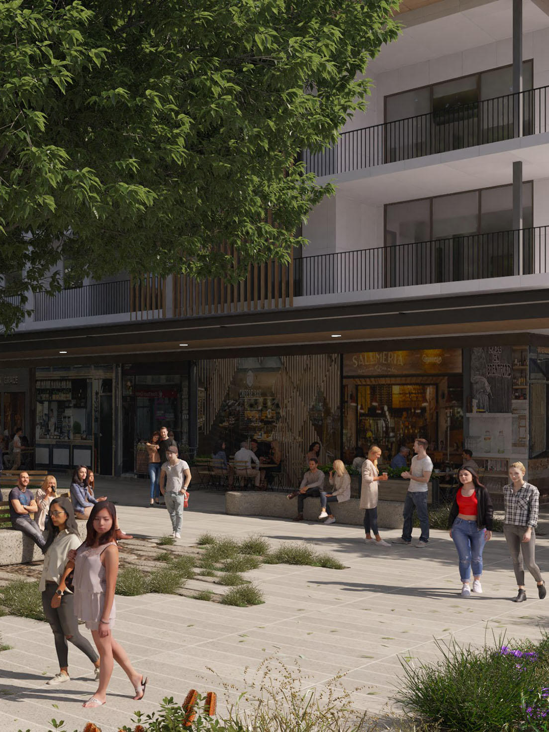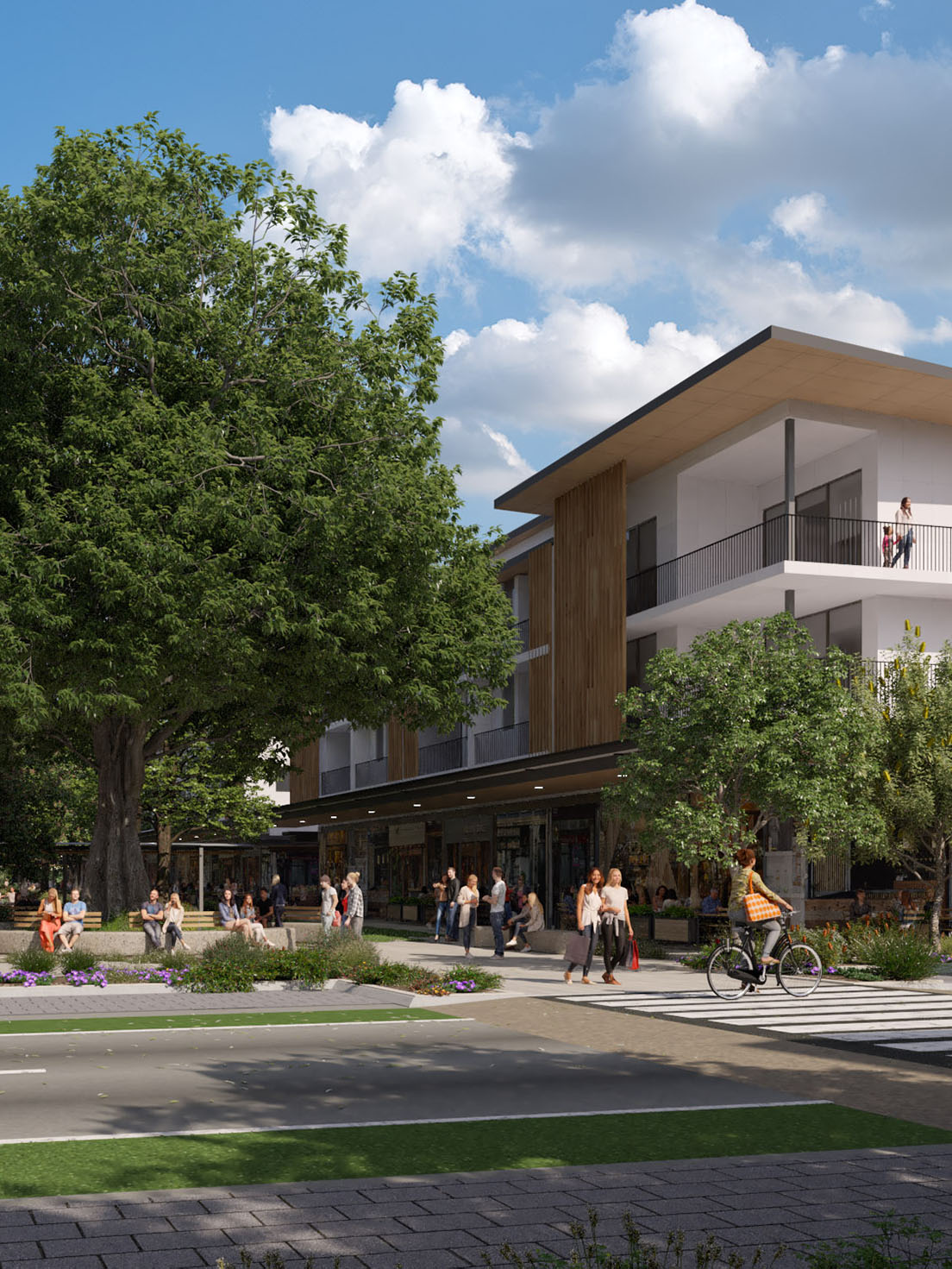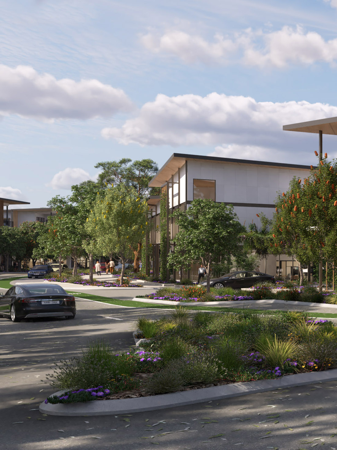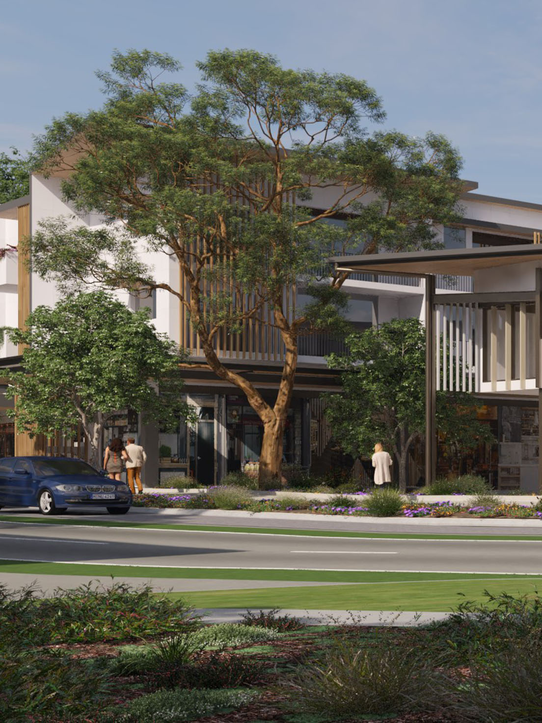 Main Street is defined by extensive greenery and shade, mature street trees and wide planted verges. Landscaped retail and residential entries using local species create welcoming destinations for visitors and residents.