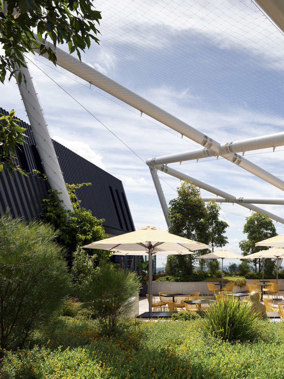 The rooftop at Soko Restaurant is not only a landscaped sanctuary providing expansive city views but is also reflective in form and scale of the quintessential Queensland outdoor living area. A Brush Box (Lophostemon confertus) forest emerges from the building and reaches into the sky – creating a green marker from considerable distances. From concept, it was imagined as a habitat in the sky – a place for biodiversity to reestablish and to nurture and sustain Brisbane’s unique flora and fauna.