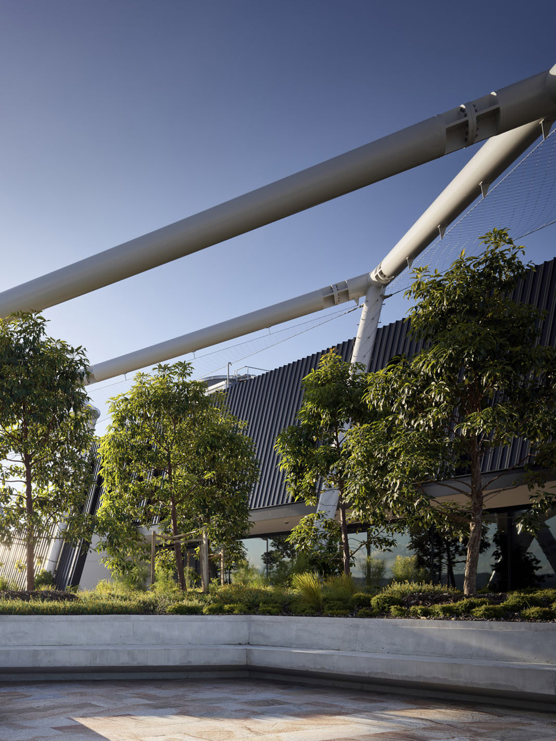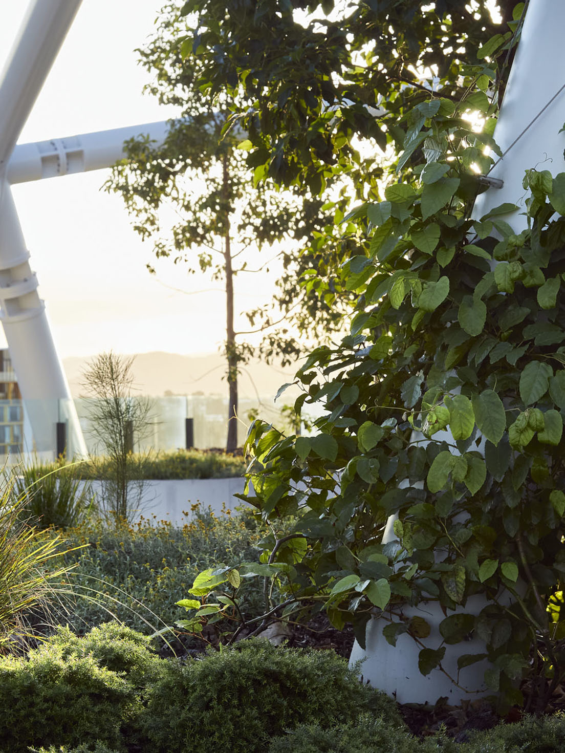 Clinging to the exposed skeletal frame of the building, Kangaroo Vine (Cissus antartica) spreads out to create yet another layer of a cooling, green landscape. Chosen for its considerable growth and reach, the vines will continue growing to create a mosaiced green web that will provide additional shade, habitat and greenery.